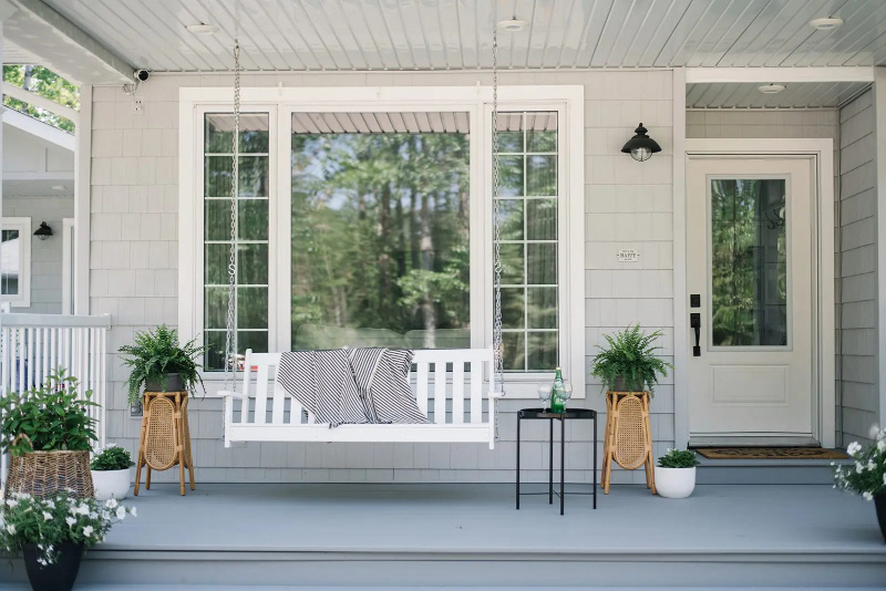 Talk about a farmhouse-style porch. Rhonda of Hallstrom Home has included Everything you need to enjoy a casual spring front porch. The single bed serves as a sofa/bench for front-porch naps. The curtains add a layer of privacy and coziness. The vintage watering can with greenery (lavender?) and the blue vintage pitcher on the wood side table provide the most relaxing setting. There is even a vintage mirror on the wall. A woven rug adds warmth and softness to the porch floor.