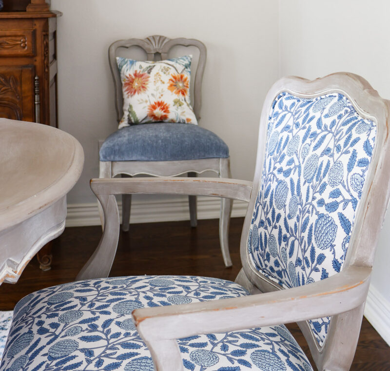 Before we left for France, I took the fabric and the two captain chairs to be upholstered. While in France, I received a text saying the side chairs were ready, but there wasn’t enough fabric for the captain chairs. That turned out to be a happy thing.