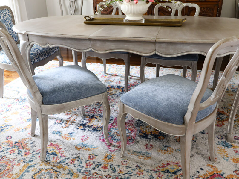 A few years ago, when we updated our living room, I reupholstered our Bergere chair in blue velvet. We also had an ottoman made in the same fabric for our new seating room (former breakfast room). I had so much fabric left over, and I thought it would be enough to recover the chairs in the dining room.