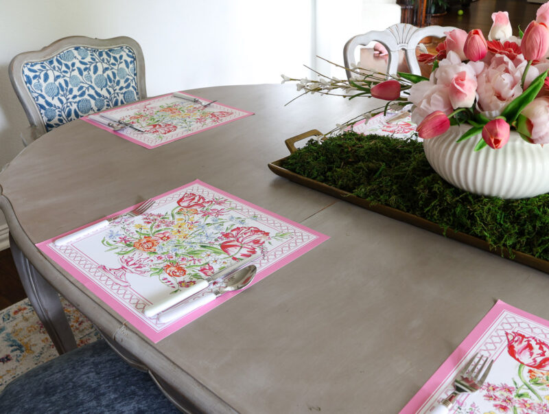 Every spring, I host the end-of-season lunch for my Bible Study group, dear friends who gather one last time before summer schedules take over. It’s one of my favorite occasions of the year, because it gives me the perfect excuse to do what I love most: set a beautiful table and cook for the people I care about. This year, I set a casual spring luncheon tablescape inspired by a beautiful placemat and a springtime floral centerpiece.