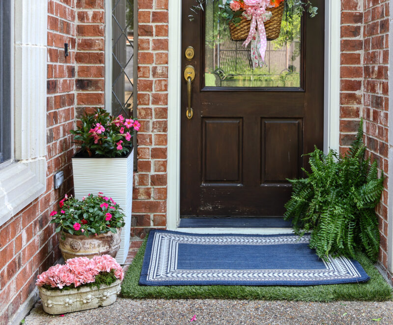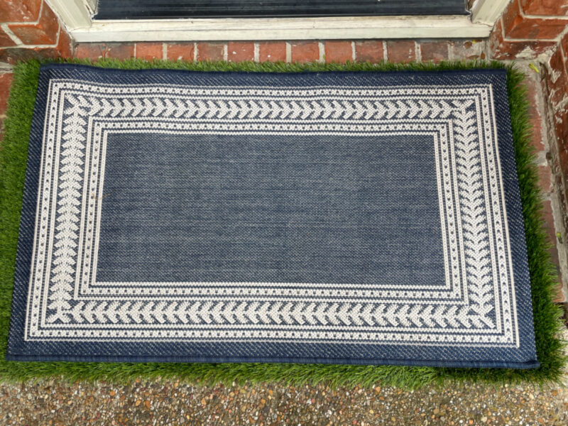 On top of the green grass, I placed a pretty blue outdoor mat that I “bought” at Ballard Designs last summer. I bought two – one for the front door and one for the back door.