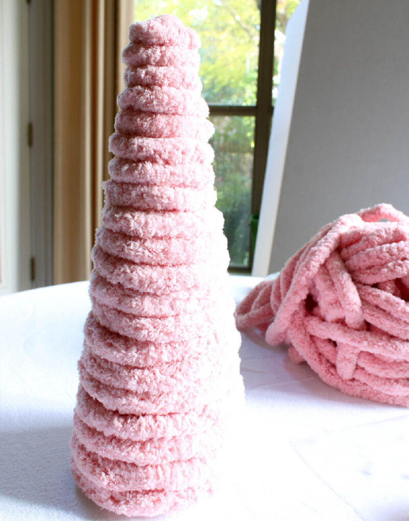 Keep in mind that the larger and chunkier your yarn, the less you will need. Obviously, the size of your styrofoam cone also determines how much yarn you will use. Also, the bigger your styrofoam cone, the chunkier your yarn can be.